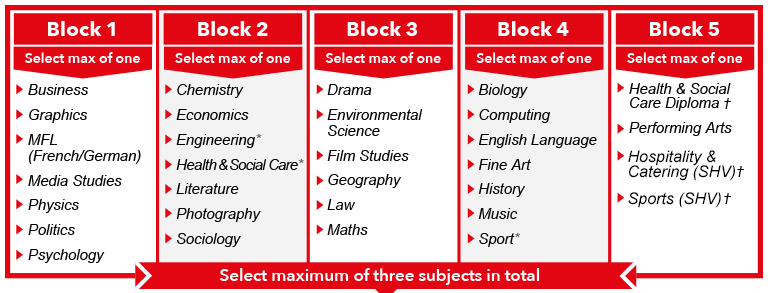 † Health & Social Care is available as one of your three subject choices or as a diploma. If you wish to study diploma please select it in Subject Block 5. Hospitality and Catering and Sport are also available as extended diplomas, again in Subject Block 5.